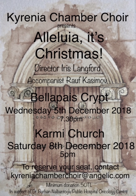 The Kyrenia Chamber Choir will be giving 2 concerts at the beginning of December. The first is on Wednesday 5 December in the crypt of Bellapais Abbey and the second on Saturday 8 December at Karmi church. They will be conducted by Iris Langford and the choir will be accompanied by Rauf Kasimov. See the poster for booking details. Please come and join us for an evening of festive entertainment with some audience participation in singing some well-known Christmas Carols.