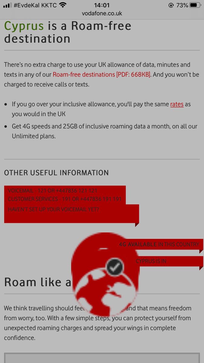 Vodafone as a company have always recognised that N Cyprus is on a different telephone system to the ROC - a quick Google search shows a 2016 tariff guide that explicitly highlights that ‘Cyprus’ excludes the North. So it’s pointless quibbling about this with their employees who clearly don’t know, and just accept that sometime this year Vodafone is removing Turkey AND N Cyprus from all of its roaming except the most expensive plan. But, as myself and others have pointed out, for contracted plans the price on the ticket is there to be haggled, and discounts of 30% + have been given (if you are prepared to spend hours on the phone with their operatives). I’ve detailed elsewhere on the forum that, taking into account the cost of the Entertainment side package included with my plan (Spotify Premium), I am spending just over £13 a month for unlimited calls, text and data, plus global roaming and 100 mins EU calls.