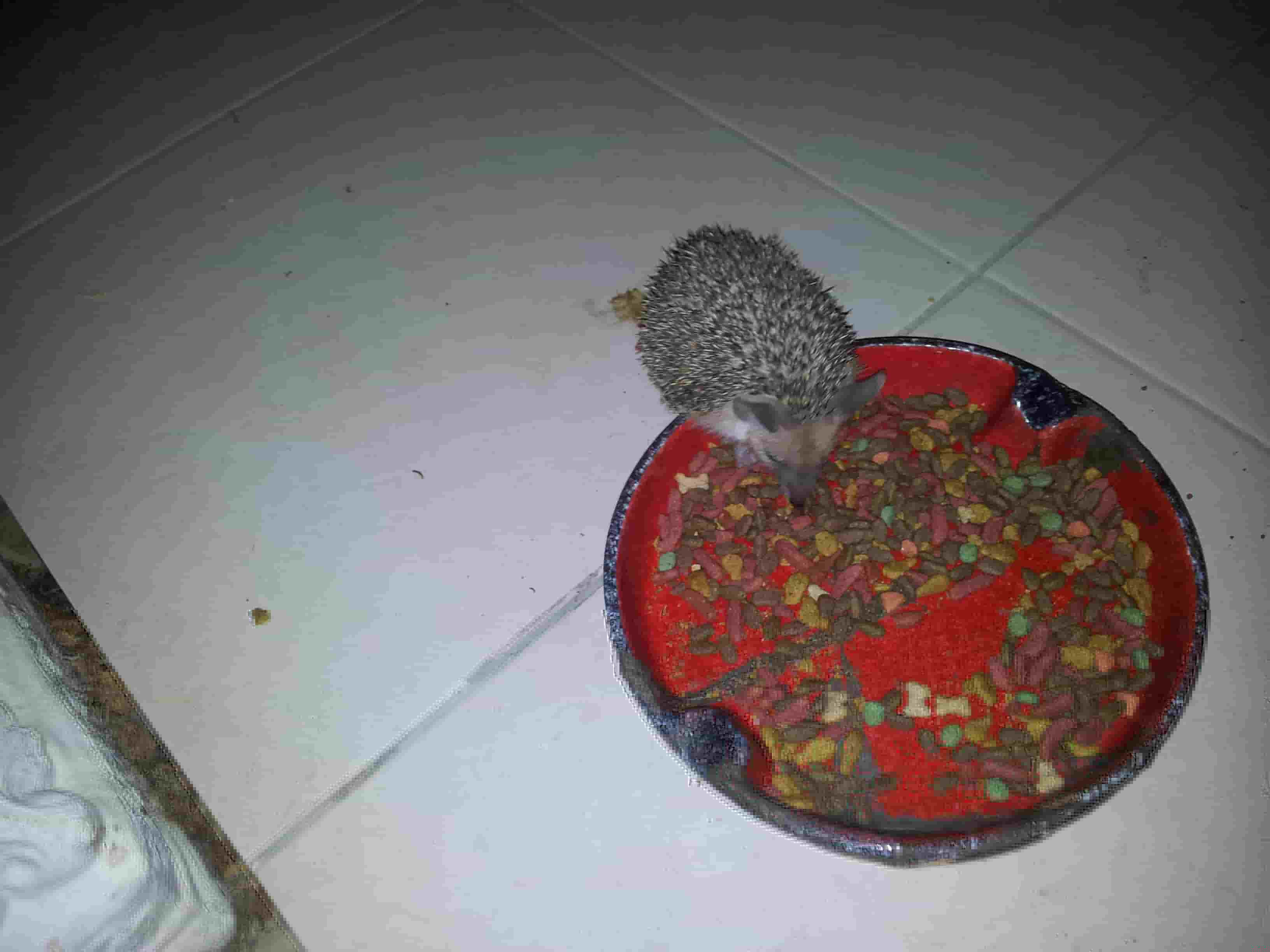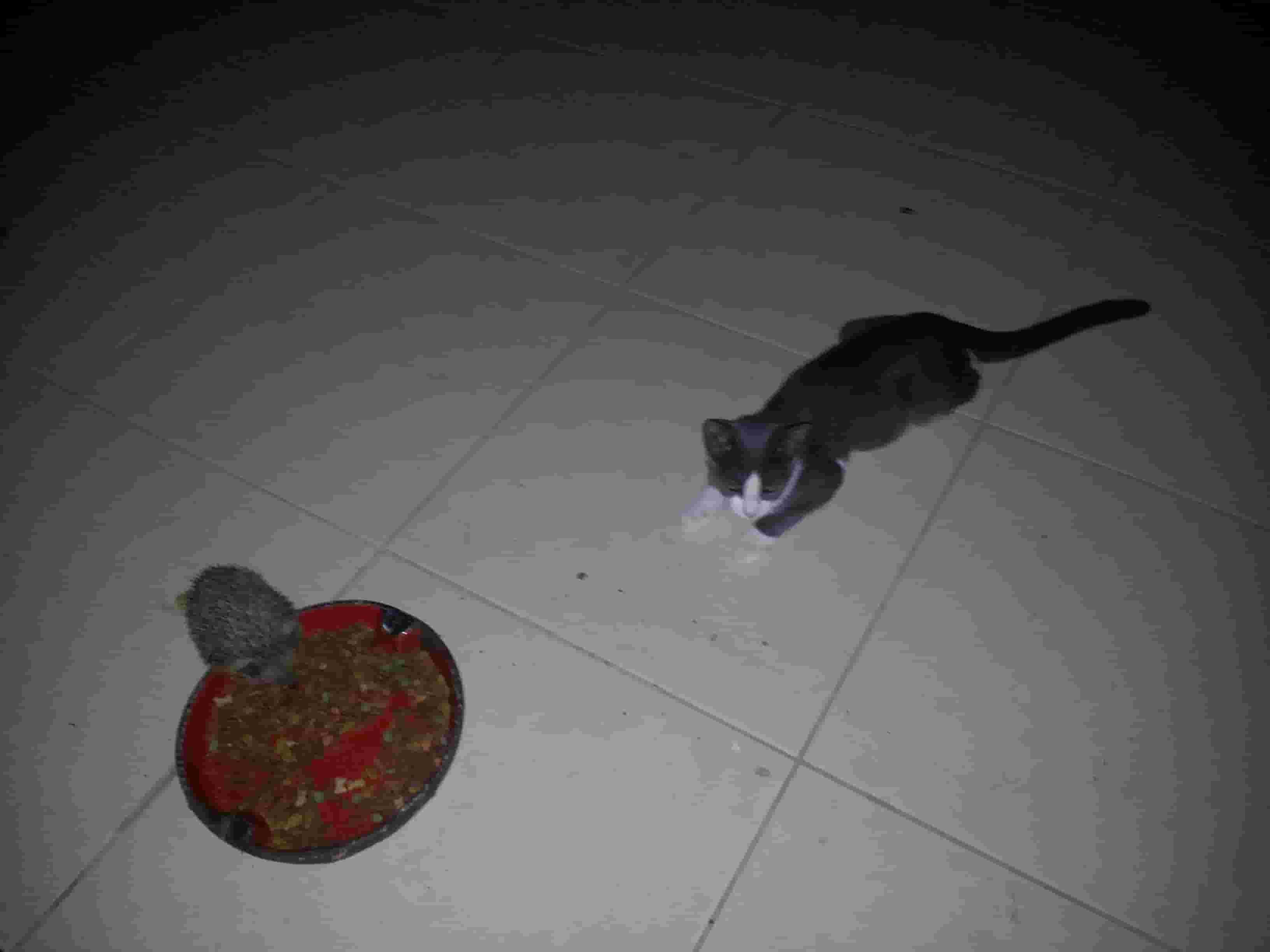Ben, the Hedgie, still comes every night for his tucker - Bertie, the kitten, always likes to watch Ben munching away!