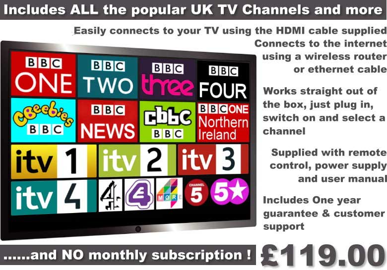 Our set top box doesn't need to be connected via an extra proxy or, a VPN connection and comes pre-configured to receive all the popular, free to air, UK TV channels.