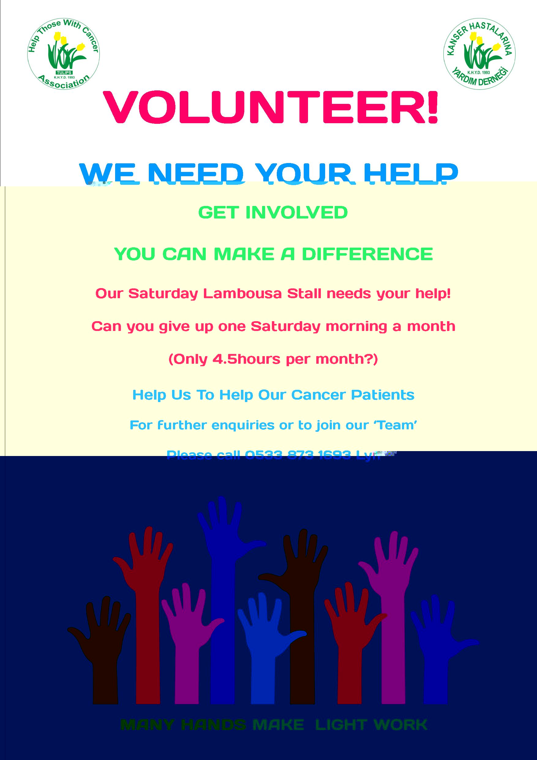 Due to sickness and a couple of our volunteers leaving the island we are now looking for new volunteers to help with our Saturday Lambousa Stall.