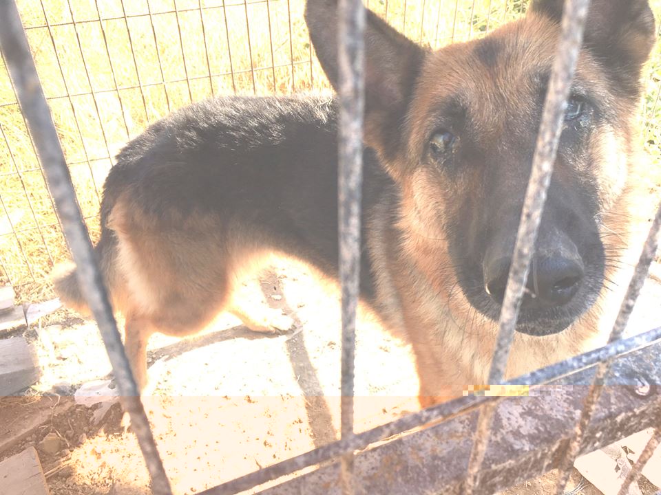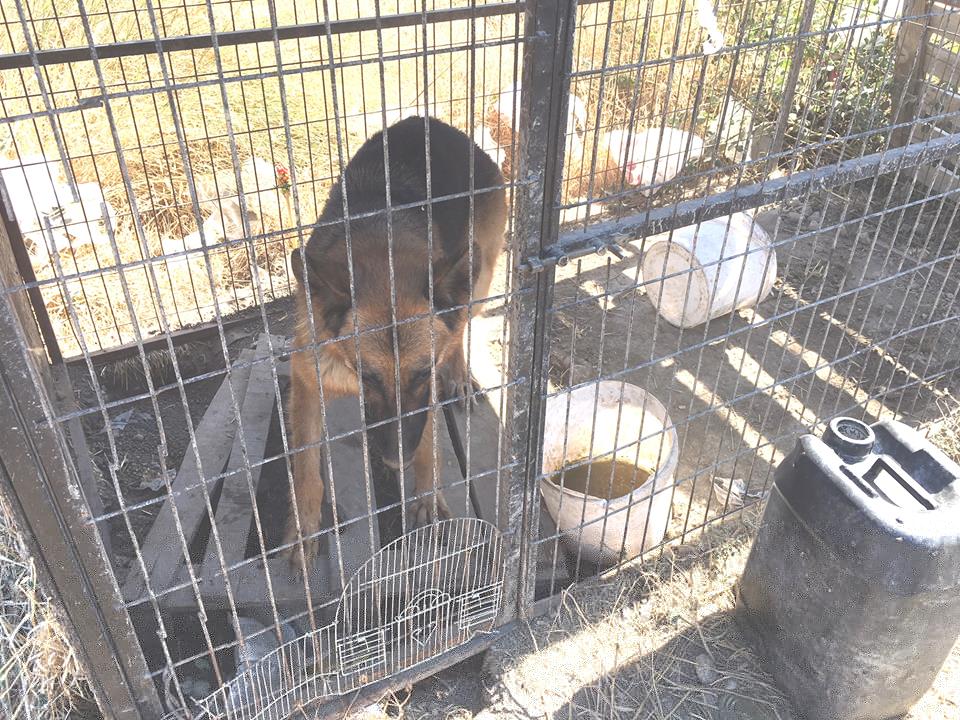 These two GSDs have endured living in appalling conditions in Alsancak for many months. The female had been in a small cage with dirty bowls and rubbish, was extremely thin and with both eyes badly infected. The male was on a short chain attached to a tree unable to reach either the water tank shelter or the dirty water bowls which were in amongst dirt and rubbish.