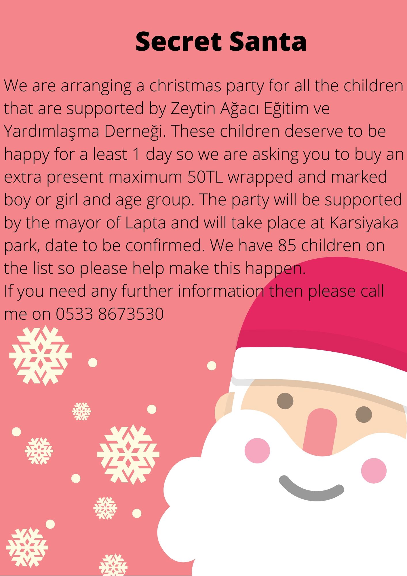 Secret Santa is back. This year we are going to try and give 85 underprivileged children a Christmas to remember but we need your help. We are asking you to buy an extra Christmas present for a child aged between 3 and 17, wrap it and mark girl or boy and age. Bestseller Alsancak have agreed to be a drop-off point. We are hoping to arrange the party on the 28th December but this is to be confirmed. Please please help. If you need any further information or would like to offer your support on the day please call me on 0533 8673530