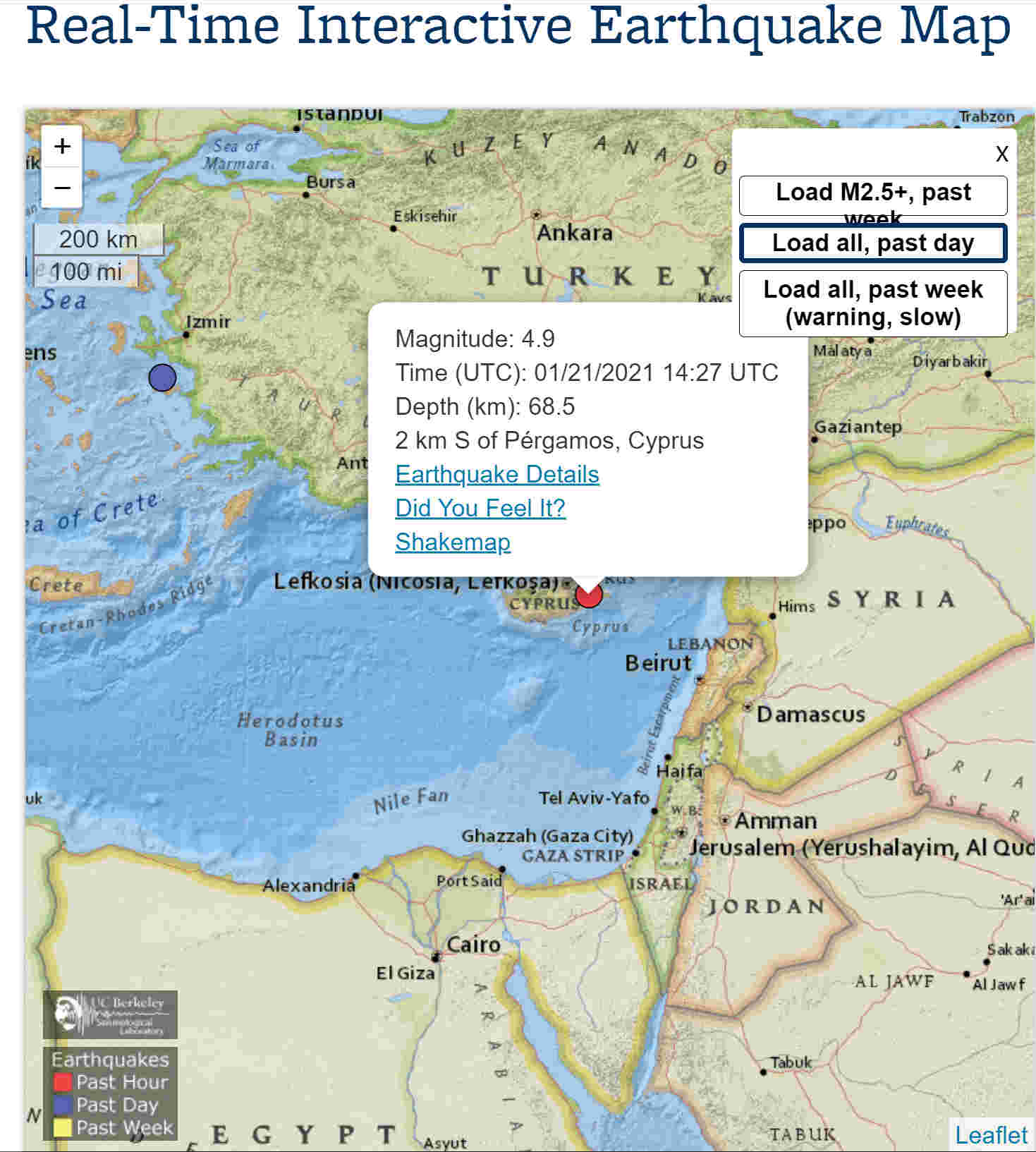 Moderate mag. 5.4 earthquake - Eastern Mediterranean, 13 km northeast of Larnaca, Larnaka, Cyprus, on Thursday, 21 Jan 2021 4:27 pm (GMT +2) - 20 minutes ago
