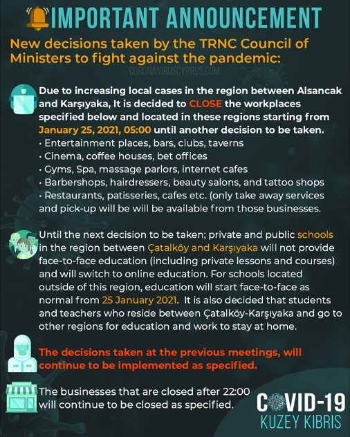 1. Until the next decision to be taken in private and public schools in the region between Çatalköy and Karşıyaka, it has been deemed appropriate to stop the face-to-face education (including classroom, study, private lessons and course activities) and to switch to online education. Schools outside of this region have been deemed appropriate to adopt a diluted face-to-face education (including classroom, study, private lessons and course activities) as of January 25, 2021. However, it was not deemed appropriate for students and teachers who resided in the Çatalköy-Karşıya region and went to other regions to study and work, to go to educational institutions and work until the next decision.