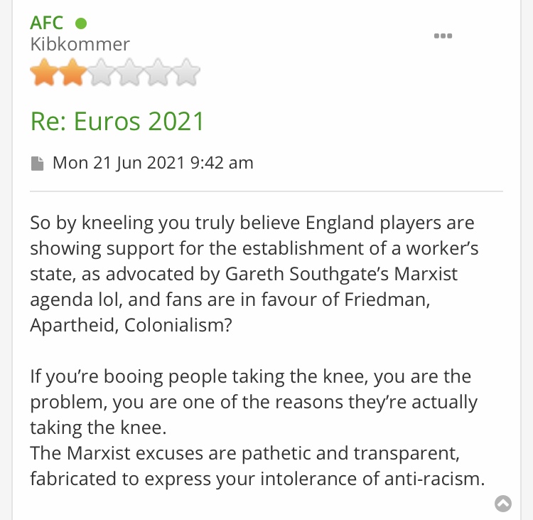 As for political views, I really find that that totally irrelevant to this discussion. A good friend, who stood for the Conservative party leadership elections has heavily criticised the Millwall fans who booed their own players for taking the knee against racism, so would that make him a marxist now?