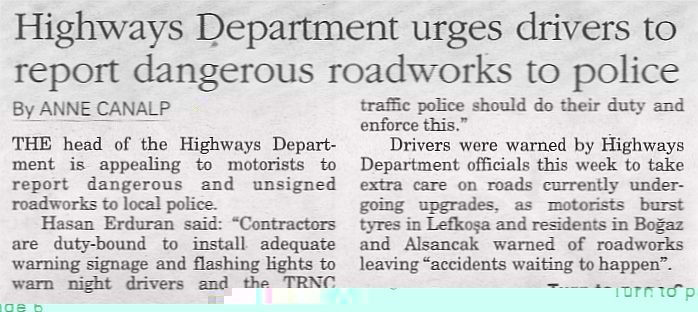 An article in Saturday's Cyprus Today urged everyone who experiences badly signed/dangerous roadworks to report them to the Police immediately, and they will prosecute, as there have been several accidents already.