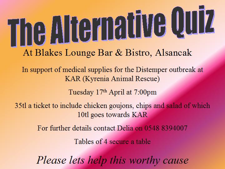 Blakes Lounge Bar and Bistro are holding an Alternative Quiz tomorrow night, all welcome, teams of 4 wanted, we have 34 people to date but could do with another 3 - 4 teams of 4, please come and support this worthy cause